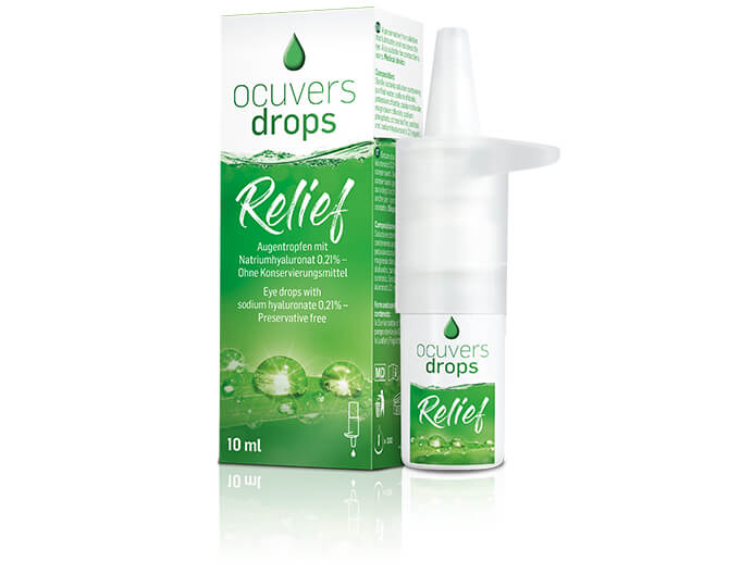 Biocompatible eye drops with 0.21% sodium hyaluronate. ocuvers drops Relief eye drops have a lubricating effect and are particularly recommended to relieve symptoms of dry, tired, irritated or stressed eyes.